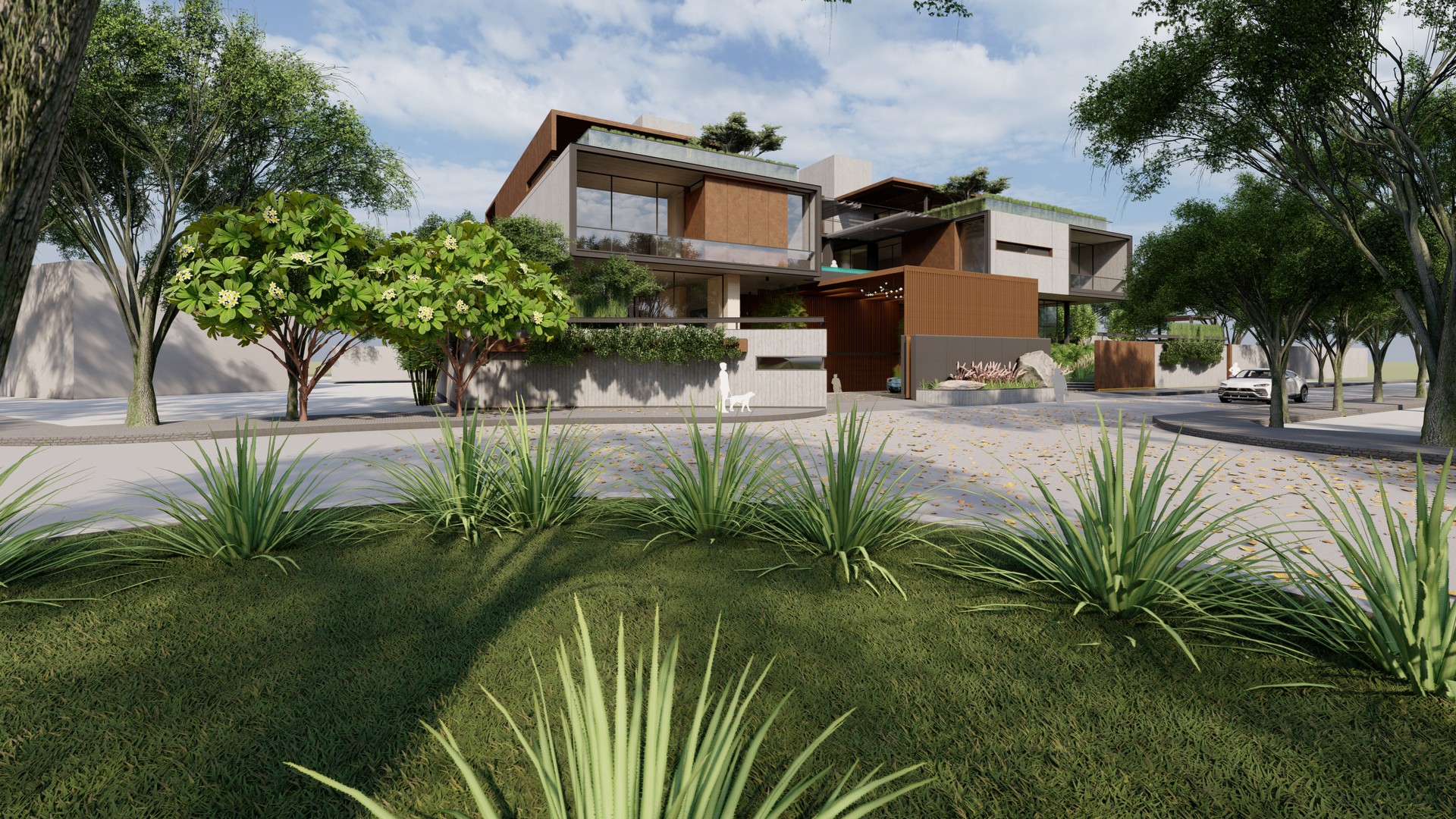 Villa Nandan Baug Terraces, situated on the outskirts of Ahmedabad, stands as a testament to modern architectural brilliance harmonized with verdant surroundings. With a built-up area of 57,268 square feet, this residence seamlessly marries innovation and elegance to create a unique haven for two families seeking a shared yet distinct abode. The villa's design narrative is defined by its stepped massing, where the ground floor recedes, granting way to a floating concrete first floor that seems to levitate above. This not only imparts an airy and open ambiance but also affords the luxury of elevated green spaces, blurring the lines between indoor and outdoor living.