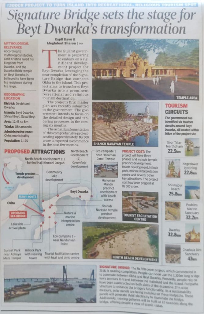 The Government is preparing to embark on a significant development project for Beyt Dwarka, leveraging the near-completion of the Signature Bridge that connects Okha to the island. This project aims to transform Beyt Dwarka into a prominent recreational and religious tourism destination.